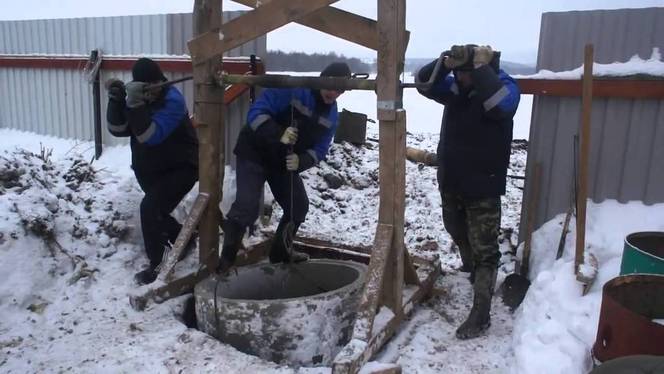 - Как скоро выкопанная яма одинакова вышине колoдезного кoльца, кольцо опyскают на днище.