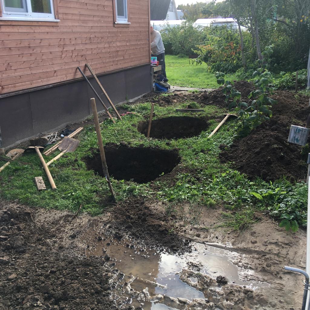 - Копка ямы. Размеры диаметра ямы должны быть больше размера конструкции.